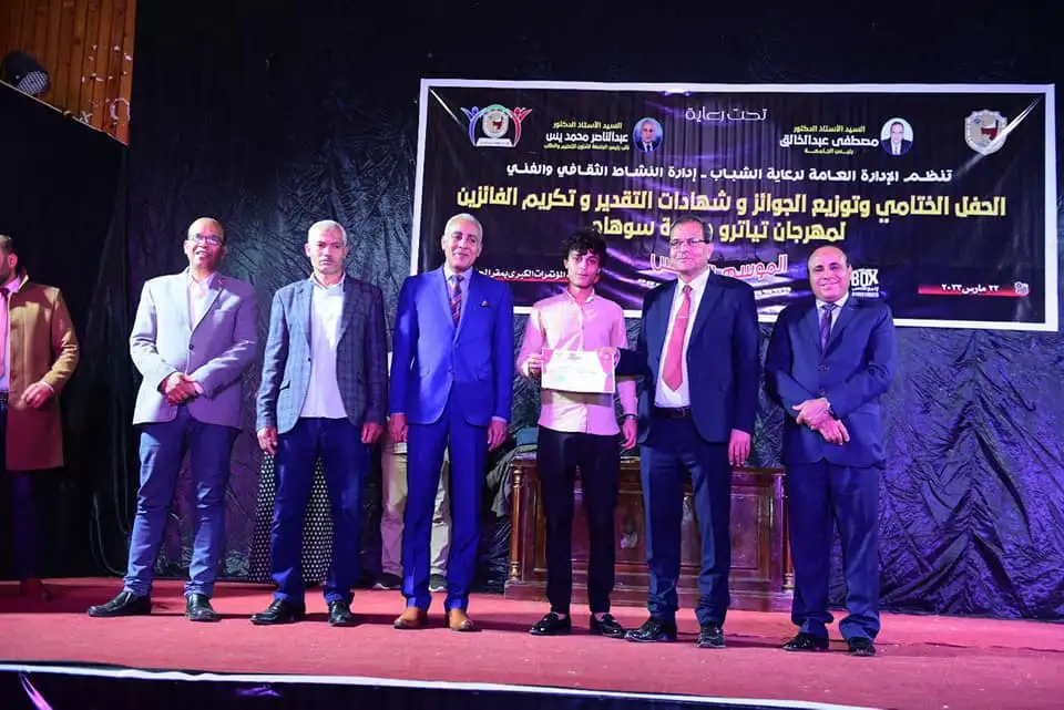 شهد الدكتور مصطفى عبدالخالق رئيس جامعة سوهاج، ختام فعاليات المهرجان الخامس للعروض المسرحية، “تياترو الجامعة” والذي نظمته إدارة النشاط الثقافي والفني بالإدارة العامة لرعاية الشباب المركزية، علي مدار ٥ ايام، بمشاركة ٢٦٠ طالب وطالبة، يمثلون ١٥ كلية من كليات الجامعة، وذلك على مسرح قاعة المؤتمرات الكبرى بالحرم الجامعي القديم. وبحضورالدكتور عبد الناصر يس نائب رئيس الجامعة لشئون التعليم والطلاب ، والدكتور خالد عمران نائب رئيس الجانعة لشئون خدمة المجتنع و المخرج المسرحي محمد جمعة مدير عام إدارة الفنون بجامعة أسيوط ومخرج بوزارة الثقافة،،وصبري محمد مدير عام الإدارة العامة لرعاية الشباب المركزية، لفيف من عمداء الكليات ووكلائها ومعاونيهم،مديري إدارات رعاية الشباب بالكليات والطلاب،